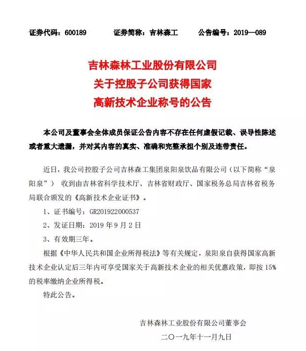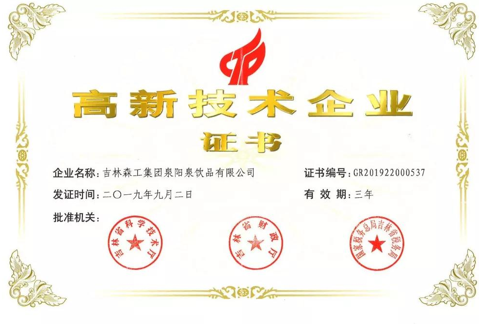 ? ? ? 根據(jù)科學技術廳、吉林省財政廳、國家稅務總局聯(lián)合頒布的《關于公布吉林省2019年第一批國家高新技術企業(yè)認定結果的通知》,經(jīng)過層層審核,吉林森工集團泉陽泉飲品有限公司由吉林省科學技術廳、吉林省財政廳、北京市國家稅務局、國家稅務總局吉林省稅務局局聯(lián)合批準下發(fā)的高新技術企業(yè)認定。
